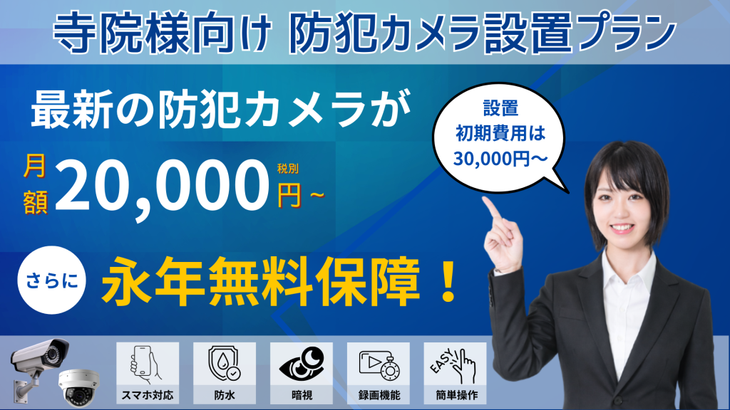 境内や本堂、駐車場など、お寺に適した防犯カメラの導入について、設置場所や機種選定からご相談いただけます。